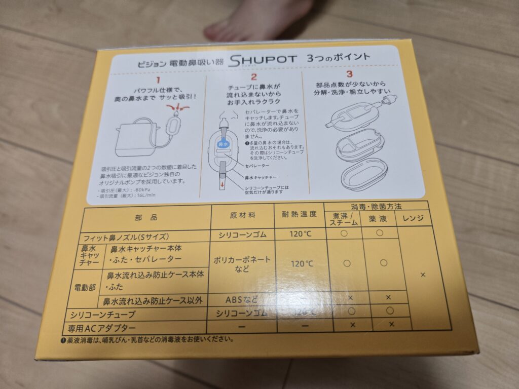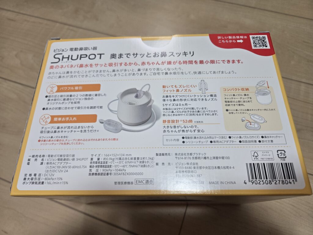 今回は、最終的にたどり着いた ビションの電動鼻吸い器「SHUPOT(シュポット)」 を実際に使ってみた感想を、良い点・気になる点も含めて詳しくレビューしていきます。