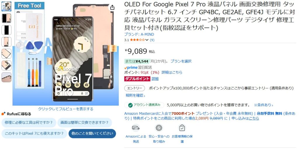 ちなみに故障当時に近場の修理業者に依頼した際にはPixel7Proは対応していないと断られました。こういう時はiPhoneであれば断られることは無いので有利ですね。