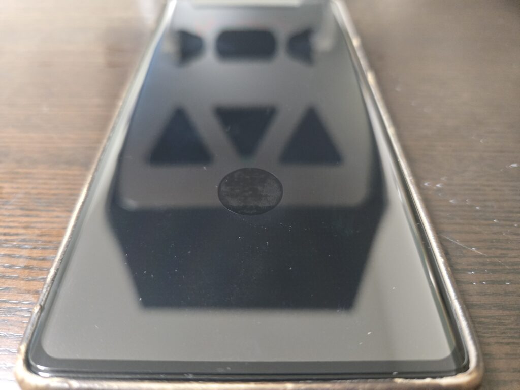 こちらはおまけなので参考ですが、付属のディスプレイ保護シートも取り付けたところ、写真の通りで指紋認証の部分の色味が異なり気になります。